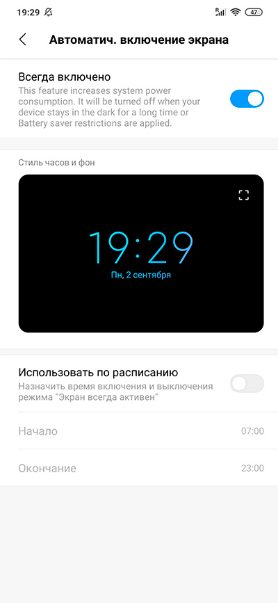 У многих смартфонов Xiaomi есть режим постоянно включенного экрана, когда на выключенном дисплее показываются дата и время. Включается это в разделе "Настройки - Экран - Автоматич. включение экрана".