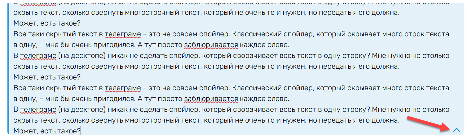 В телеграме (на десктопе) никак не сделать спойлер, который сворачивает весь текст в одну строку? Мне нужно не столько скрыть текст, сколько свернуть многострочный текст, который не очень то и нужен, но передать я его должна.