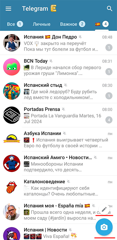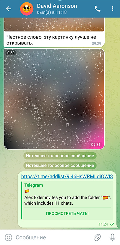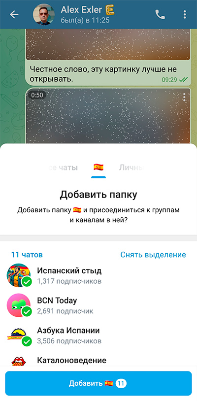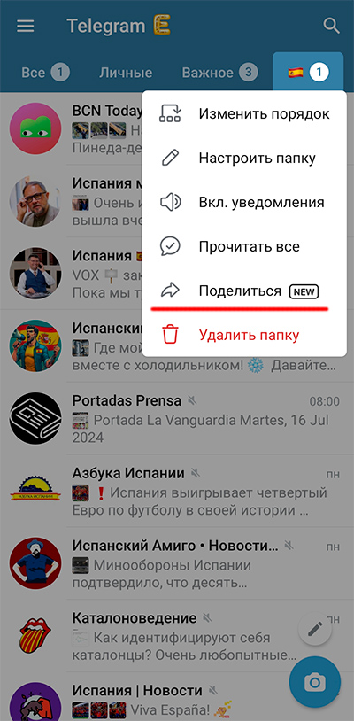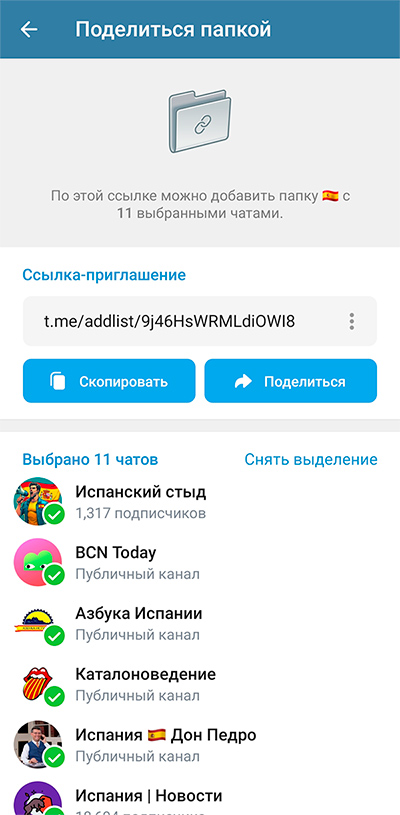 Об этом вообще очень мало кто знает, данная возможность появилась в Telegram совсем недавно. Например, меня спрашивают, какие русскоязычные каналы об Испании я читаю. У меня эти каналы сгруппированы в отдельной папке (еще раз отсылаю к своей статье об удобной организации каналов). Длинное нажатие на папке, в меню теперь есть пункт "Поделиться". Причем набор каналов, которыми вы делитесь, можно редактировать (например, исключить какие-то каналы).