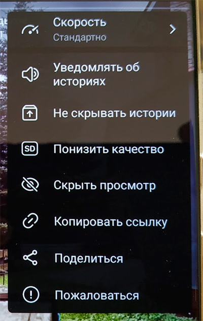 Как снова получить доступ к историям какого-то абонента? Найти его в списке, нажать на его аватар - появится последняя история, и там есть следующее меню.