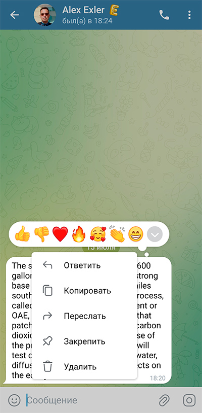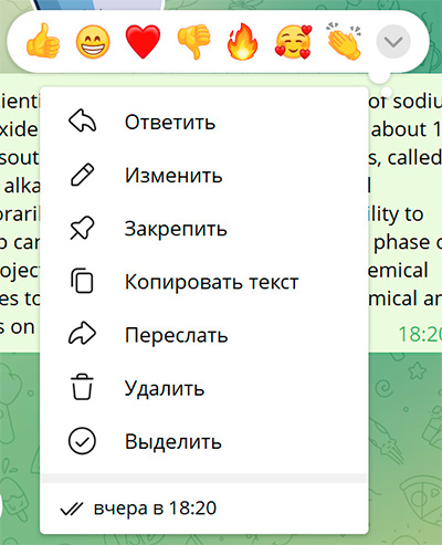 Но что-то мы не видим такой возможности ни в верхнем меню чата, ни в контекстном меню сообщения, печаль!