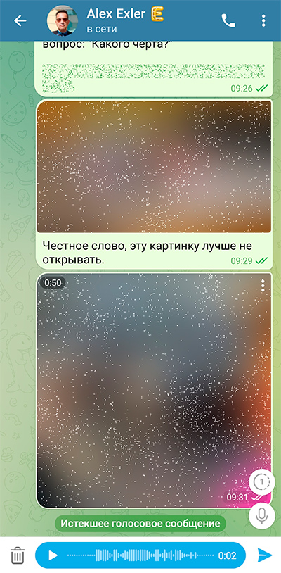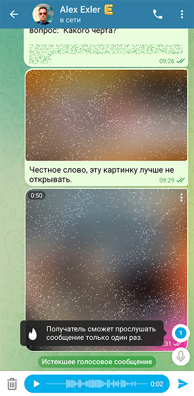 После этого для записи голосового сообщения в чате вам нужно просто поднести смартфон к уху и начать говорить. Закончили сообщение, уберите смартфон от уха - голосовое сообщение будет подготовлено к отправке. Причем обратите внимание на кружочек с цифрой 1, который появляется над значком микрофона: если по нему нажать, то на голосовом сообщении будет стоять пометка уничтожить сразу после прослушивания - мало ли, может понадобиться такое.