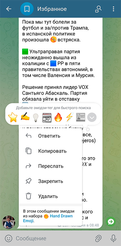 Занесли несколько сообщений в Избранное. Заходите туда и ставите соответствующие эмодзи каким-то сообщениям: вы сами должны определить, что для вас означают те или иные эмодзи на сообщениях в Избранном.