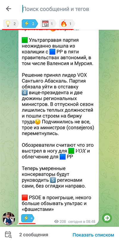 После этого соответствующий тэг появится слева снизу на сообщении, а при нажатии на пиктограмму поиска, под строкой поиска появятся все тэги и количество сообщений с данным тэгом, по которым сообщения можно отбирать.