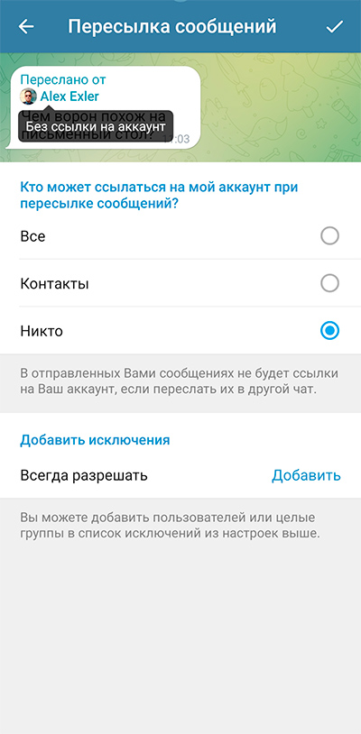 Если вы часто общаетесь в каких-то групповых чатах (комментариях к каналам), то может быть очень нежелательным, чтобы ссылкой на ваш аккаунт делились при пересылке. Это настраивается в разделе "Настройки - Конфиденциальность - Пересылка сообщений".