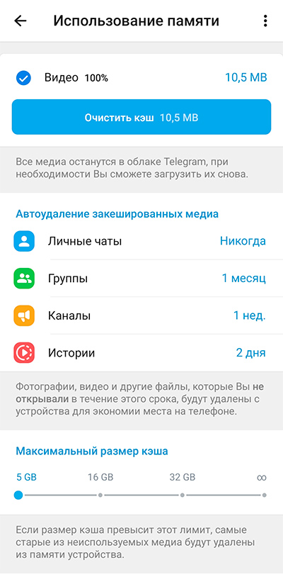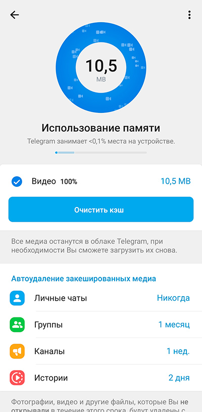 По умолчанию у Telegram стоит неограниченный лимит на хранение всяких медиаданных. И если у вас много каналов со всякими медиа, а памяти в смартфоне не сказать, что слишком много, то имеет смысл и почистить используемое приложением пространство, и задать для него определенные ограничения.