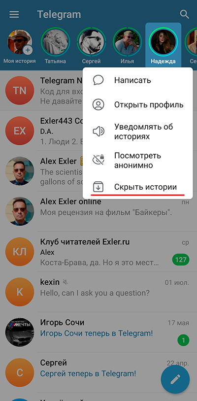 Более того, если вам эти истории вообще никак не сдались, вы их не смотрите и смотреть не собираетесь, то можно немного напрячься и вообще убрать их из верхней части Telegram.