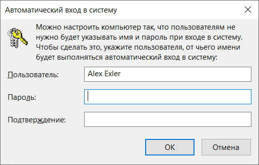 Появится вот такое окно, в котором нужно ввести логин и пароль (два раза). После нажатия на "ОК" компьютер перезагрузится, после чего вход будет производиться автоматически.