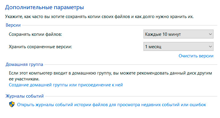 В Дополнительных параметрах выбираете, насколько часто сохранять копии файлов и сколько их хранить. Даже если сохранять часто и хранить долго, то для всяких личных документов расход пространства, учитывая нынешние объемы дисков, будет очень небольшим.