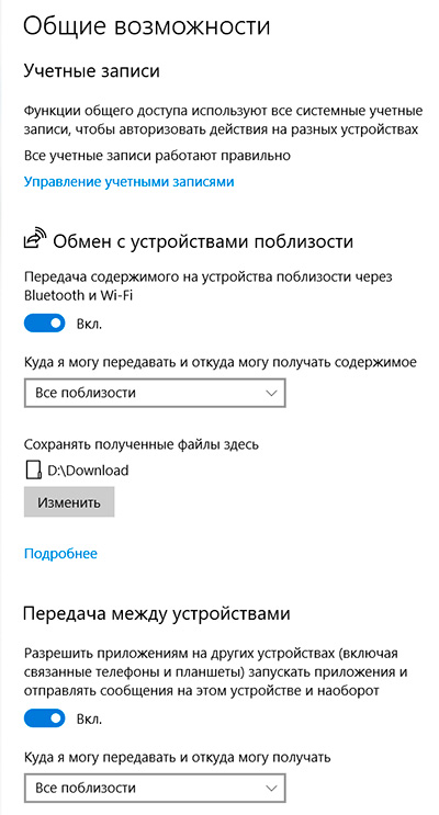 В Windows есть возможность быстрого обмена файлами с устройствами поблизости (находящимися в той же локальной сети или в той же сети Wi-Fi). Это включается в Параметры Windows - Система - Общие возможности.