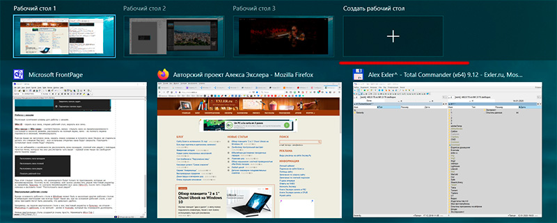 Кроме основного рабочего стола в Windows может быть и несколько других рабочих столов. Комбинация пиктограмм там всегда будет такая же, как на основном рабочем столе, а вот окна программ могут быть разными, что довольно удобно.