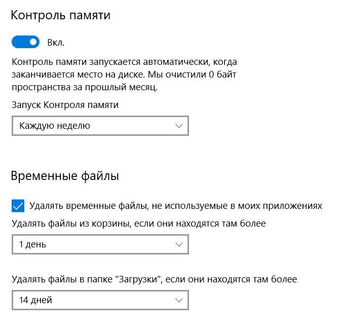 Здесь можно настроить частоту запуска контроля памяти, удаление временных файлов и файлов в папке "Загрузки".