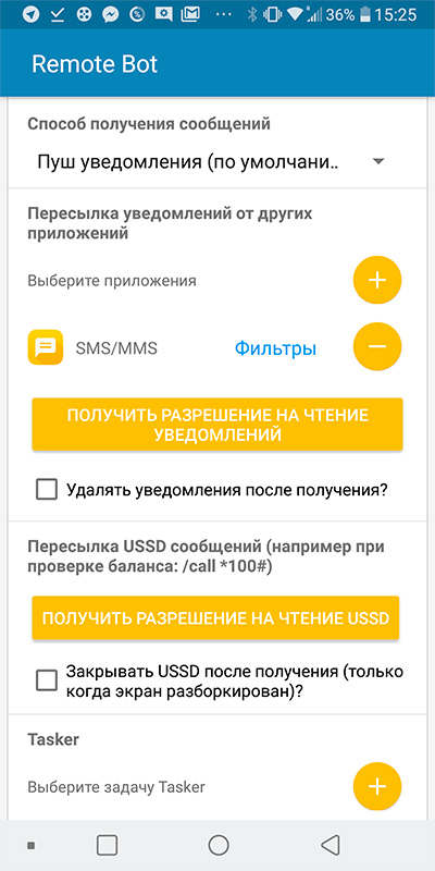 При запуске программа предлагает автоматически создать соответствующего бота для вашего "Телеграма". После этого в настройках в разделе уведомлений добавить SMS/MMS с соответствующими фильтрами, если они нужны (наличие или отсутствие какого-то текста).