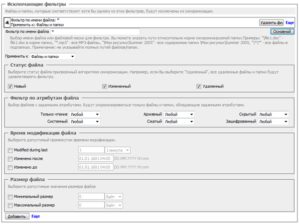 Ну и вы также можете задавать очень гибкие фильтры отбора того, что включать в синхронизацию, а что нет. Например, если из фотоальбома вам не нужны фотографии пятилетней давности - это просто можно задать в параметрах фильтрации. При этом если файлы не копируются на ноутбук, то при последующей синхронизации они, конечно, не будут удаляться - файлы просто останутся на источнике без копии на ноутбуке.