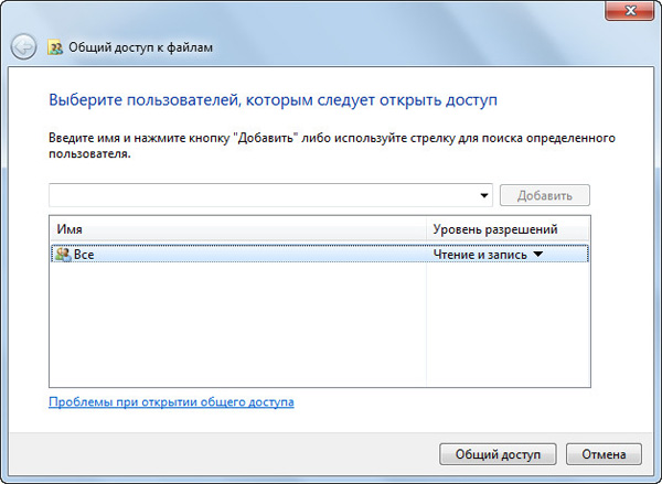 Второе. На подключенном к локальной сети ноутбуке расшарьте для доступа тот диск или ту папку, куда должны быть помещены ваши данные. Если вы храните все в папке "Мои документы" (ай, какой вы молодец), тогда на ноутбуке сделайте общий доступ к соответствующей папке. (Мы сейчас не будем лезть в дебри видов сетевого доступа.) Вы просто зайдите в свойства соответствующей папки, нажмите на кнопку "Доступ", зайдите в "Общий доступ" и там слева от кнопки "Добавить" вбейте "Все". Потом опцию "Чтение" замените на "Чтение и запись" и нажмите кнопку "Общий доступ". Вот и все, папка будет открыта для сетевого доступа. (Также еще нужно, чтобы на ноутбуке был создан пользователь с таким же логином-паролем, как на вашем стационарном компьютере.)