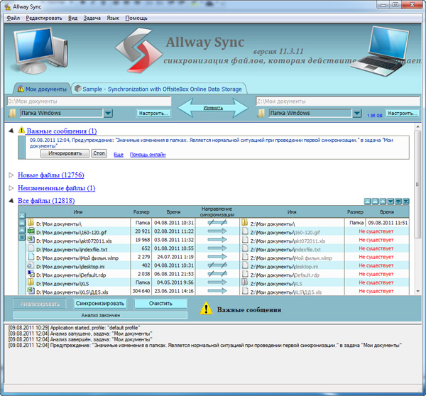 Теперь, когда все в порядке, можно нажать кнопку "Синхронизировать", и программа проведет полную синхронизацию двух папок. Когда вы вернетесь из поездки с ноутбуком, нужно будет его подключить к сети, вызвать эту программу и просто нажать одну кнопку, чтобы обновленные или добавленные файлы скопировались на стационарный компьютер. Вот и все!