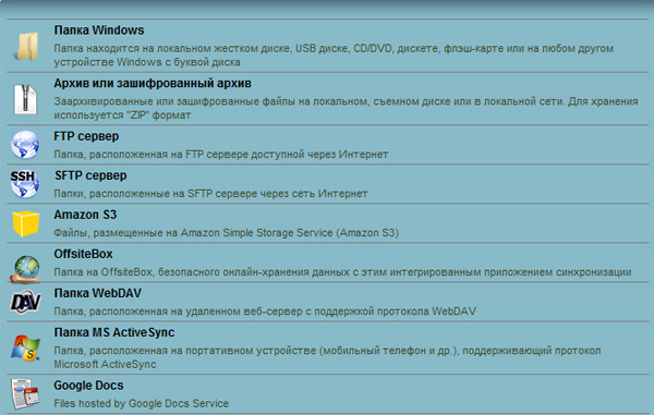 То есть программа умеет превращать ваши папки в архивы или зашифрованные архивы, копировать данные на FTP-серверы или защищенные FTP-серверы, синхронизироваться с онлайновыми хранилищами, с мобильными устройствами и документами Google Docs.