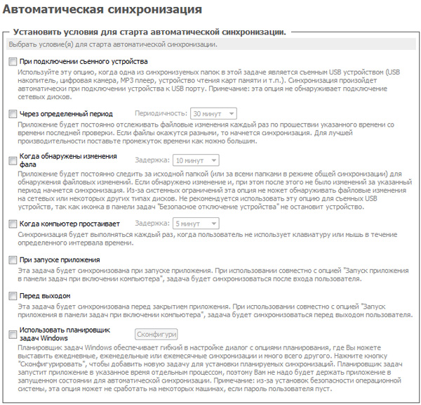 Если вы постоянно переносите файлы туда-сюда с компьютер на ноутбук и обратно, то вам, возможно, будет удобнее сделать автоматическую синхронизацию - например, по расписанию. Эта программа такое умеет делать, причем вариантов там - немало: при подключении устройства, через определенный период, при обнаружении изменений в файлах, при простое компьютера, с помощью планировщика Windows.