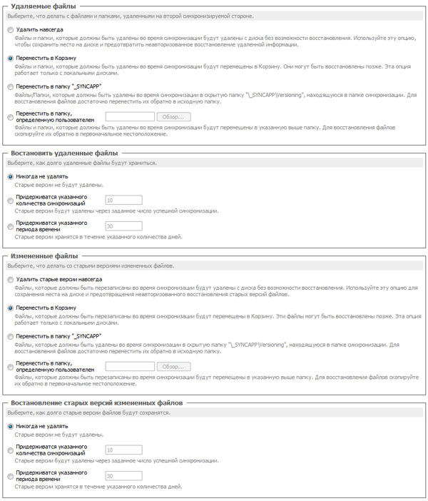 Чтобы не удалить что-нибудь очень нужное (мало ли, случайно убьете целую папку на ноутбуке, а программа при синхронизации убьет такую же на компьютере), вы можете настроить, как именно программа будет поступать с удаляемыми файлами. Например, она может хранить их в специальной папке.