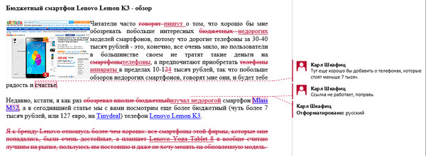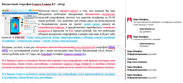 Автор делает требуемые исправления, что-то там редактирует - и снова отправляет это редактору. У того тоже прекрасно видно, как изменился документ со времени его последнего редактирования, причем изменения и дополнения, сделанные автором, показываются другим цветом - это очень наглядно. (Вообще, для исправлений каждого пользователя выбирается какой-то свой цвет.)