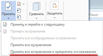 Кстати, в окончательном документе крайне желательно убрать всю историю изменений и комментарии, особенно если он предназначен для использования какими-то другими людьми. Сделать это довольно просто: нужно документ сохранить под новым именем и в меню Рецензирование - Принять выбрать пункт "Принять все исправления и прекратить отслеживание" - тогда вы получите окончательный текст (таблицу, презентацию и так далее) без всякой лишней информации.