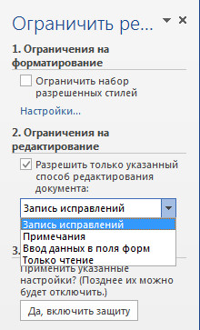 Возможности редактирования документа могут ограничиваться: например, одним пользователям будет разрешено только добавлять примечания, другим вообще разрешить только чтение. Также можно ограничивать набор разрешенных к применению стилей.