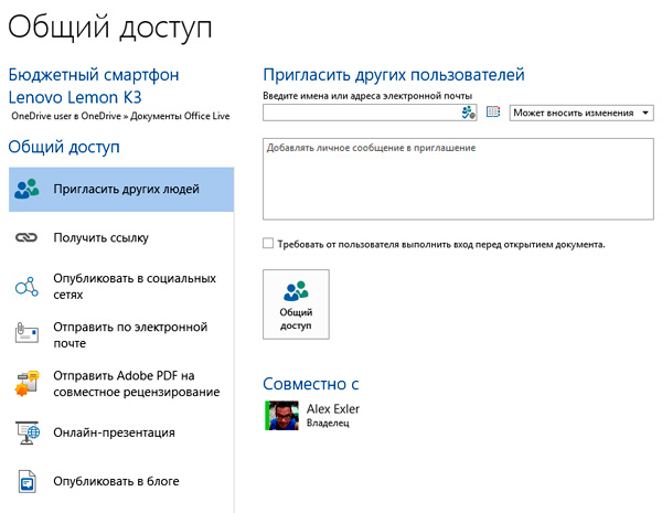 Теперь что нужно сделать? Дать доступ к этому документу вашему редактору (начальнику, коллеге). Это делается очень просто. В Word нажимаете Файл - Общий доступ. Появляется вот такое окно.
