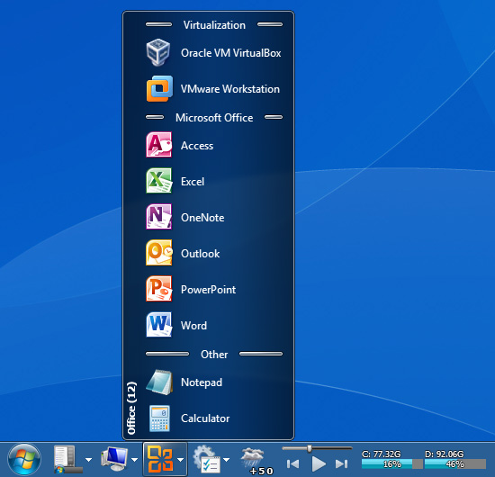 Эта софтина делает папки с набором ярлыков в таскбаре. Можно мышкой выбирать, но есть возможность поставить хоткей. В самой панели группы можно ставить разделители, чтобы отделить группы программ внутри группы. Там еще много возможностей. Полистайте. Но я использовал только эту возможность.