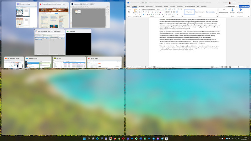 Щелкаете по ней, после чего получаете вот такую картину: в правом окне у вас размещен этот текстовый редактор, а в левом система выводит окошки предпросмотра всех запущенных на данный момент приложений, причем совершенно неважно - они минимизированы или их окна открыты.