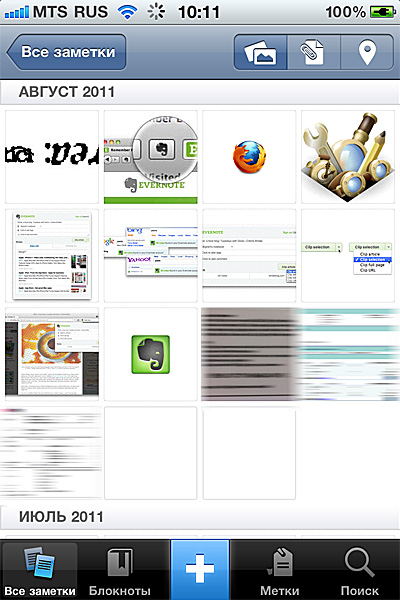 В мобильном клиенте есть очень удобная форма отбора заметок по изображениям, приложенным файлам и по местоположению создания заметки.