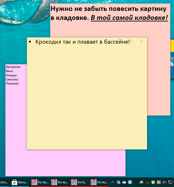 Вот тут все уже намного удобнее! Стикер по умолчанию может закрываться другими окнами, однако он ведет себя не так, как отдельное приложение. В области приложений висит только само приложение, стикеры все относятся к нему (они пропадут, если приложение закрыть, и снова появятся, если его открыть). По команде Win+D все стикеры закрываются, однако стоит открыть любое окно любого приложения - они появляются.
