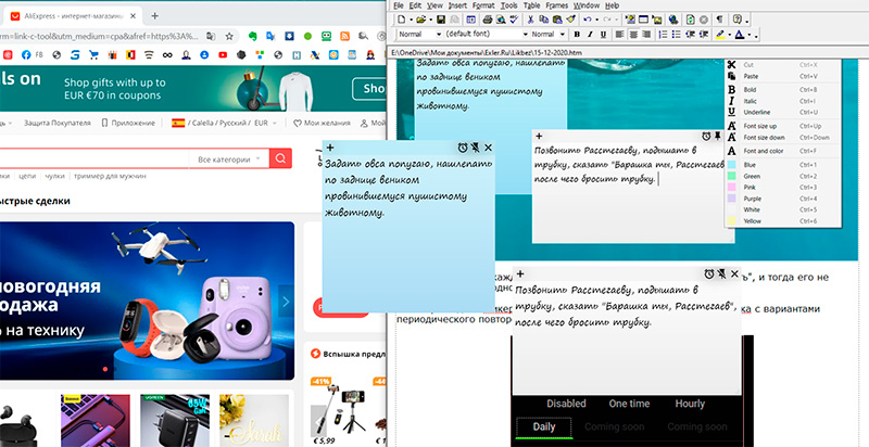 Использую Simple Sticky Notes. Есть все, что у Wedol Sticky Notes. Но у Simple Sticky Notes базу данных, где хранятся заметки, можно поместить в любую папку. Я эту папку синхронизирую через облаку между рабочим и домашним компьютерами, и можно работать с одними заметками на двух ПК. Также можно сделать несколько блокнотов, например, ДОМ и РАБОТА. И на каждом компьютере можно выводить заметки из своего блокнота. На работе, например, вспомнил что-то, что надо сделать дома, добавил заметку в блокнот ДОМ. На рабочем компе ничего не показывает, зато дома сразу появляется новая ДОМашняя заметка.