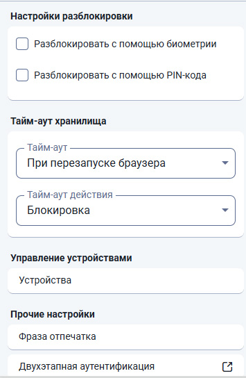 Также там можно настроить разблокировку плагина с помощью биометрии или с помощью PIN-кода. При этом для безопасности время от времени менеджер будет требовать ввода мастер-пароля.