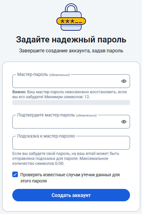 Дальше очень важный момент: создание надежного мастер-пароля для вашего аккаунта в Bitwarden. Собственно, вам нужно будет помнить только этот пароль, причем если вы его забудете, то восстановить его будет нельзя - из соображений безопасности. Единственное - вы можете задать подсказку к мастер-паролю, и вот его Bitwarden сможет выслать на ваш e-mail.